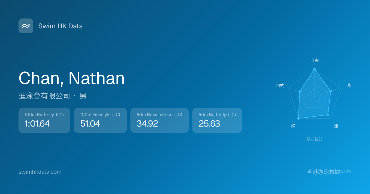 此圖表根據你所有比賽成績計算,顯示你在各泳式的相對強弱,僅供參考。繼續努力,每一次練習都會讓你更快更強!💪