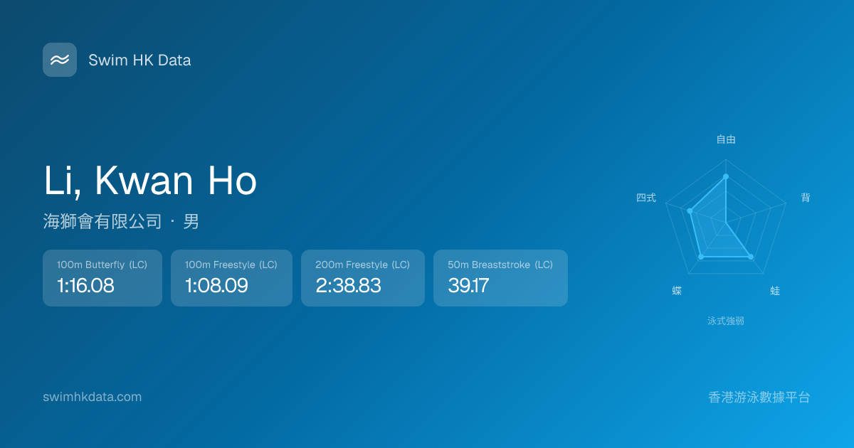 此圖表根據你所有比賽成績計算,顯示你在各泳式的相對強弱,僅供參考。繼續努力,每一次練習都會讓你更快更強!💪