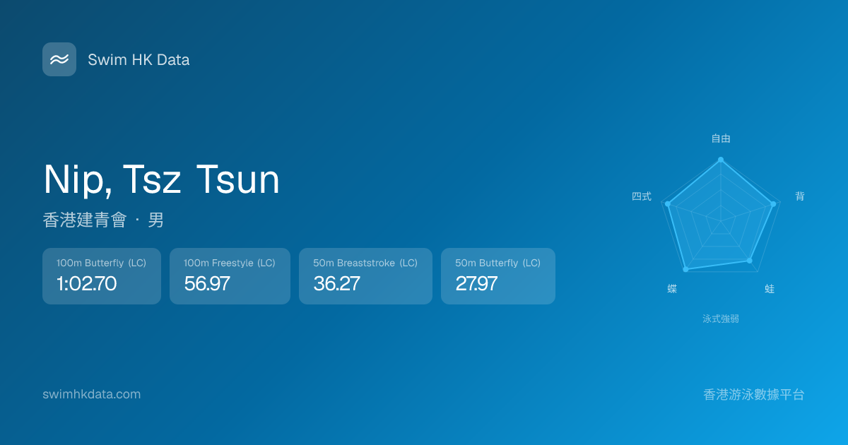 此圖表根據你所有比賽成績計算,顯示你在各泳式的相對強弱,僅供參考。繼續努力,每一次練習都會讓你更快更強!💪