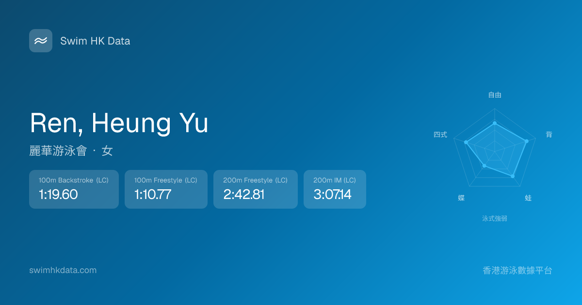 此圖表根據你所有比賽成績計算,顯示你在各泳式的相對強弱,僅供參考。繼續努力,每一次練習都會讓你更快更強!💪