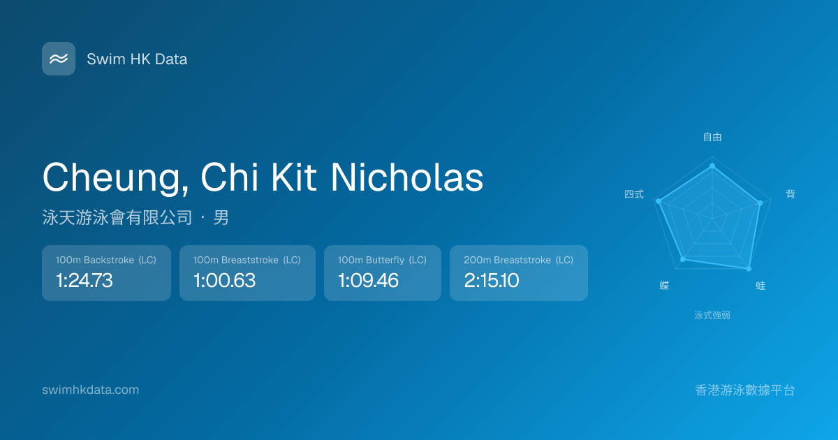 此圖表根據你所有比賽成績計算,顯示你在各泳式的相對強弱,僅供參考。繼續努力,每一次練習都會讓你更快更強!💪