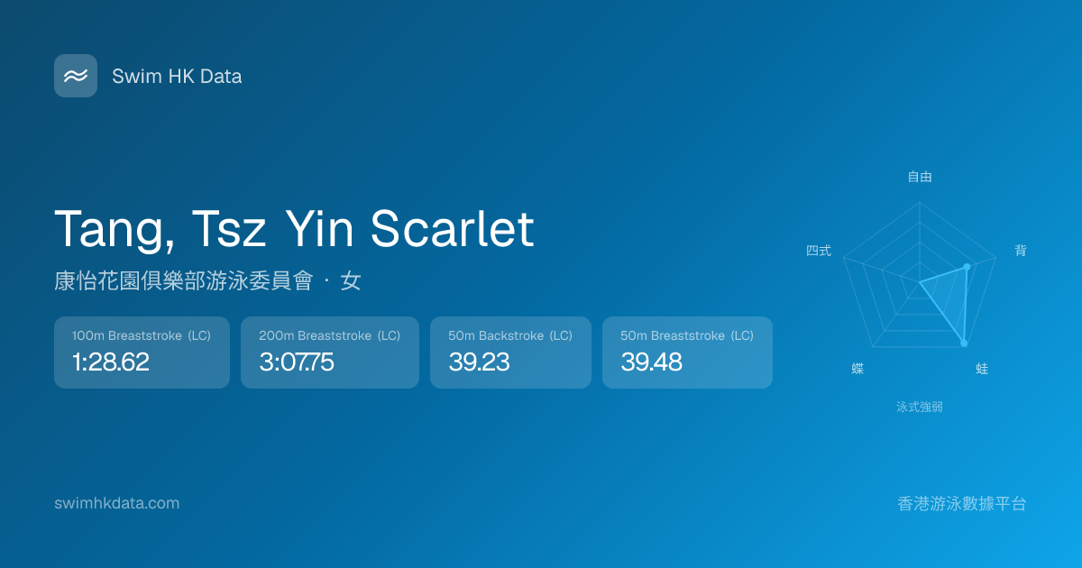 此圖表根據你所有比賽成績計算,顯示你在各泳式的相對強弱,僅供參考。繼續努力,每一次練習都會讓你更快更強!💪