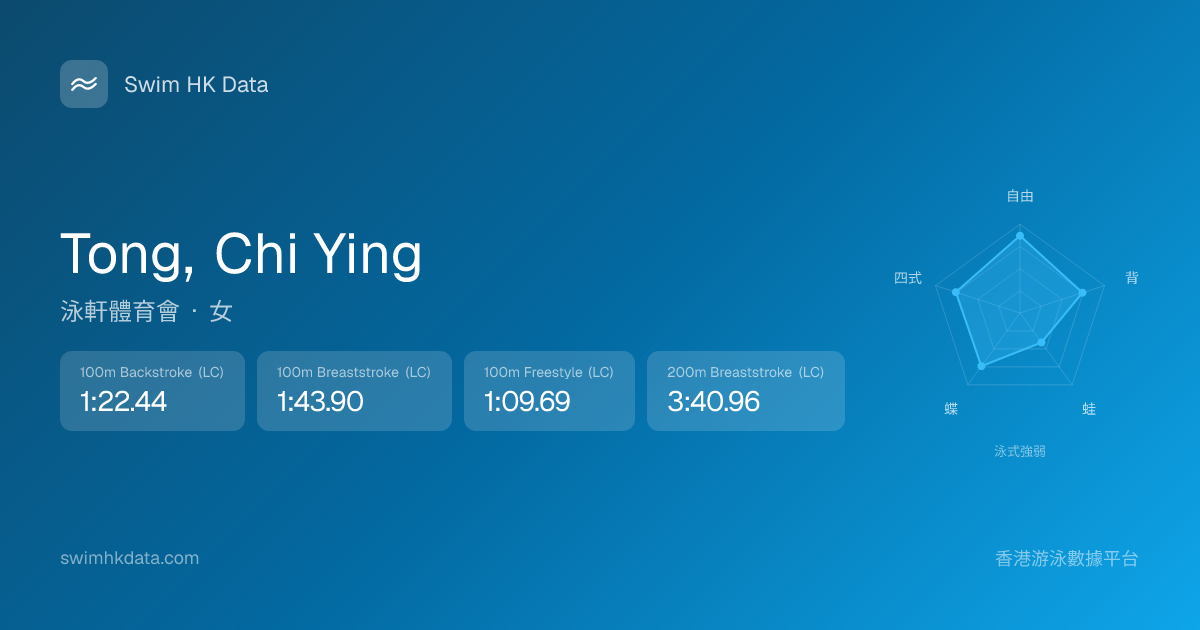 此圖表根據你所有比賽成績計算,顯示你在各泳式的相對強弱,僅供參考。繼續努力,每一次練習都會讓你更快更強!💪