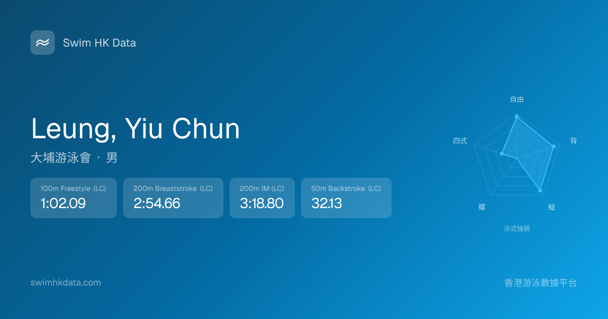 此圖表根據你所有比賽成績計算,顯示你在各泳式的相對強弱,僅供參考。繼續努力,每一次練習都會讓你更快更強!💪