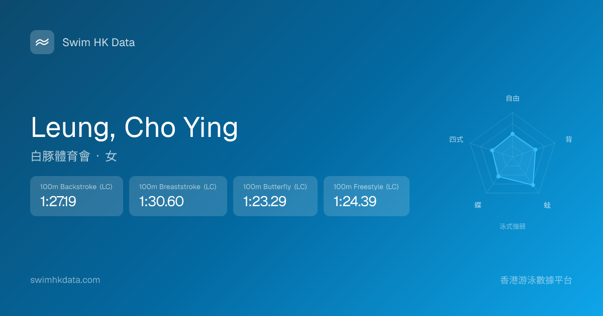 此圖表根據你所有比賽成績計算,顯示你在各泳式的相對強弱,僅供參考。繼續努力,每一次練習都會讓你更快更強!💪