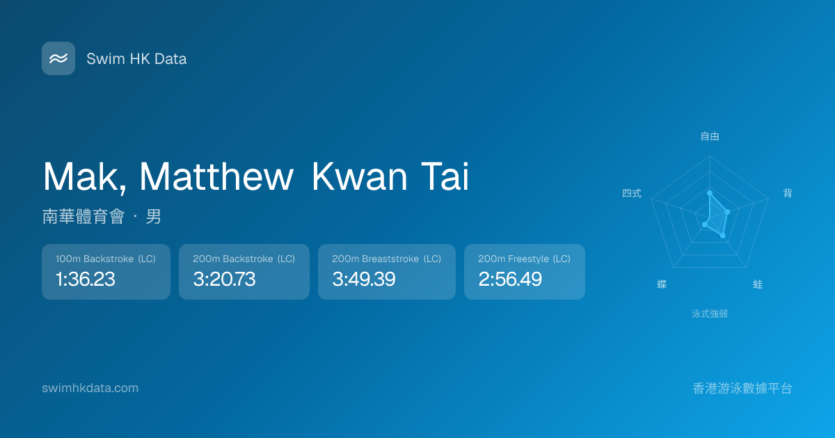 此圖表根據你所有比賽成績計算,顯示你在各泳式的相對強弱,僅供參考。繼續努力,每一次練習都會讓你更快更強!💪