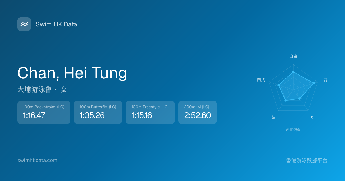 此圖表根據你所有比賽成績計算,顯示你在各泳式的相對強弱,僅供參考。繼續努力,每一次練習都會讓你更快更強!💪
