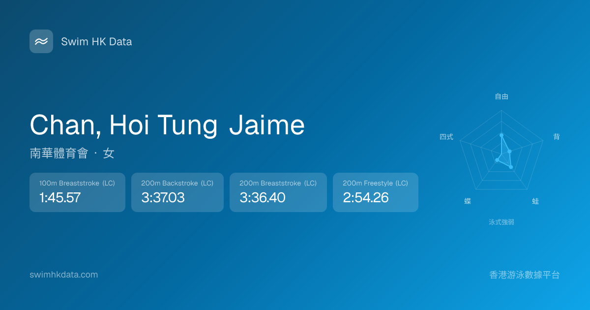 此圖表根據你所有比賽成績計算,顯示你在各泳式的相對強弱,僅供參考。繼續努力,每一次練習都會讓你更快更強!💪