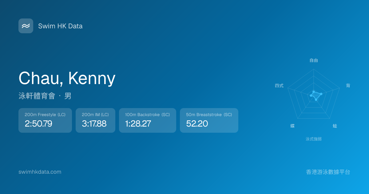 此圖表根據你所有比賽成績計算,顯示你在各泳式的相對強弱,僅供參考。繼續努力,每一次練習都會讓你更快更強!💪