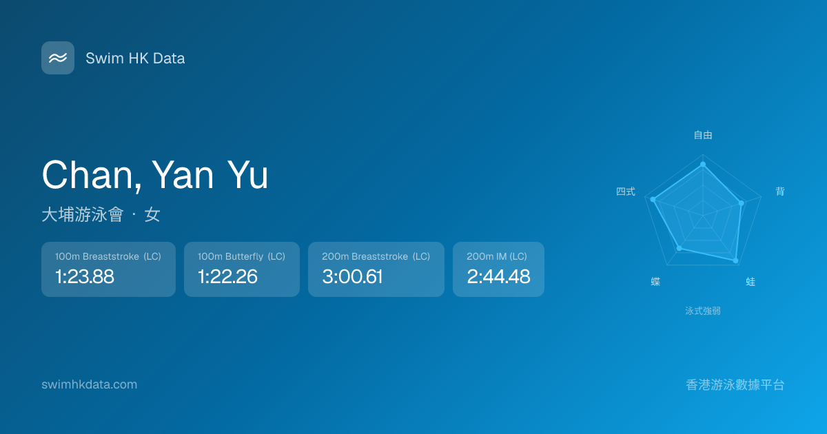此圖表根據你所有比賽成績計算,顯示你在各泳式的相對強弱,僅供參考。繼續努力,每一次練習都會讓你更快更強!💪