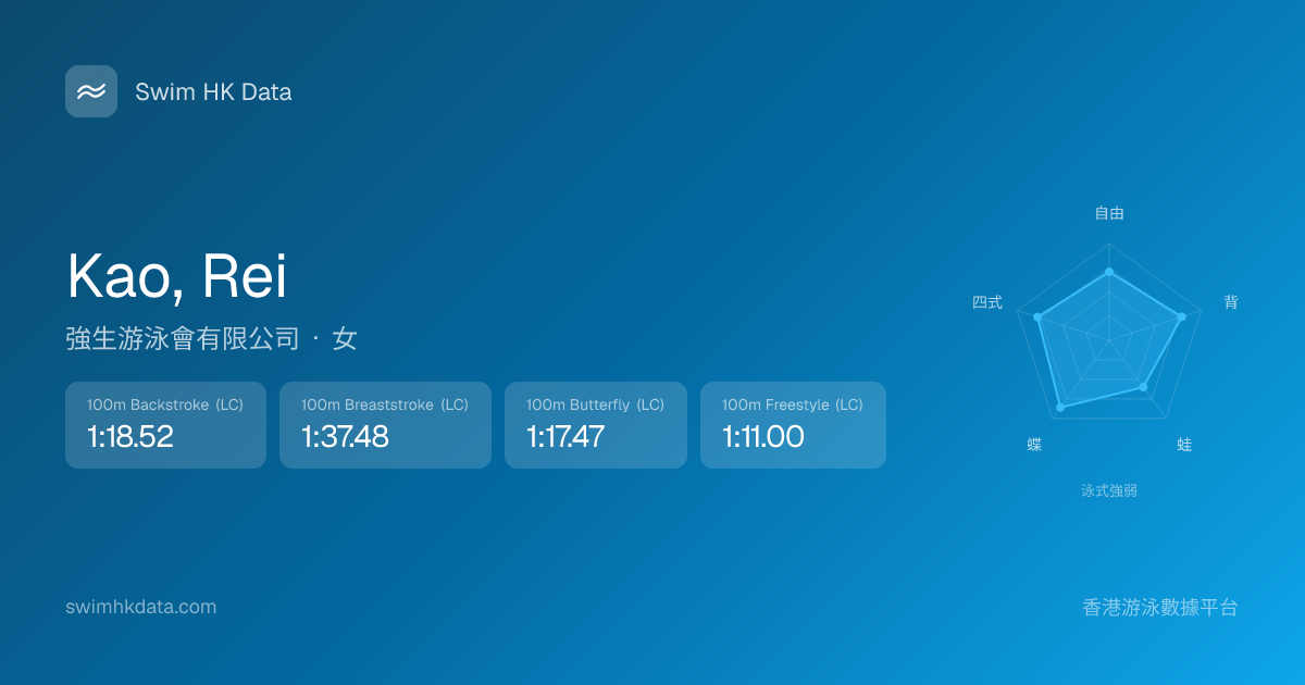 此圖表根據你所有比賽成績計算,顯示你在各泳式的相對強弱,僅供參考。繼續努力,每一次練習都會讓你更快更強!💪