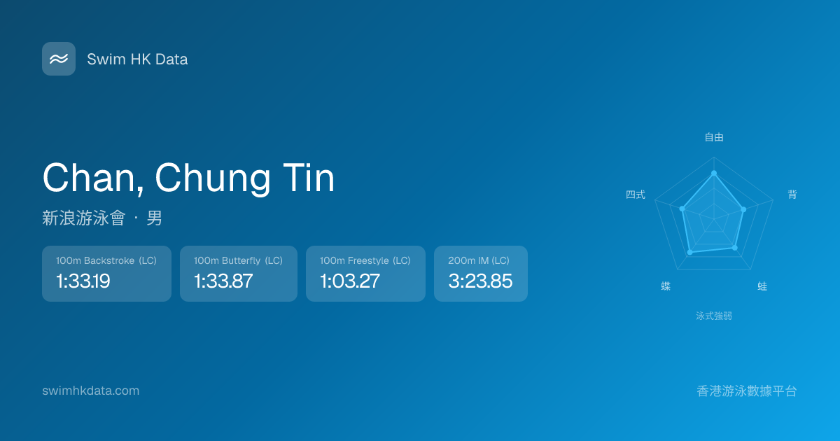 此圖表根據你所有比賽成績計算,顯示你在各泳式的相對強弱,僅供參考。繼續努力,每一次練習都會讓你更快更強!💪