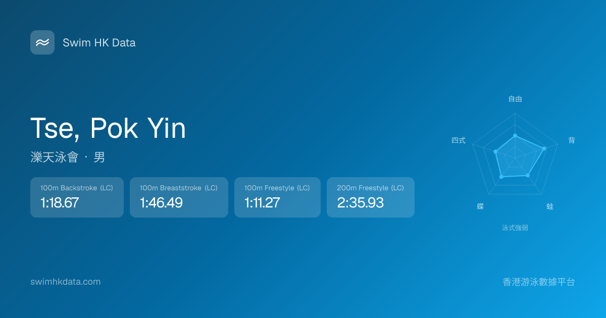 此圖表根據你所有比賽成績計算,顯示你在各泳式的相對強弱,僅供參考。繼續努力,每一次練習都會讓你更快更強!💪