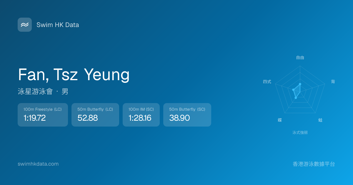 此圖表根據你所有比賽成績計算,顯示你在各泳式的相對強弱,僅供參考。繼續努力,每一次練習都會讓你更快更強!💪