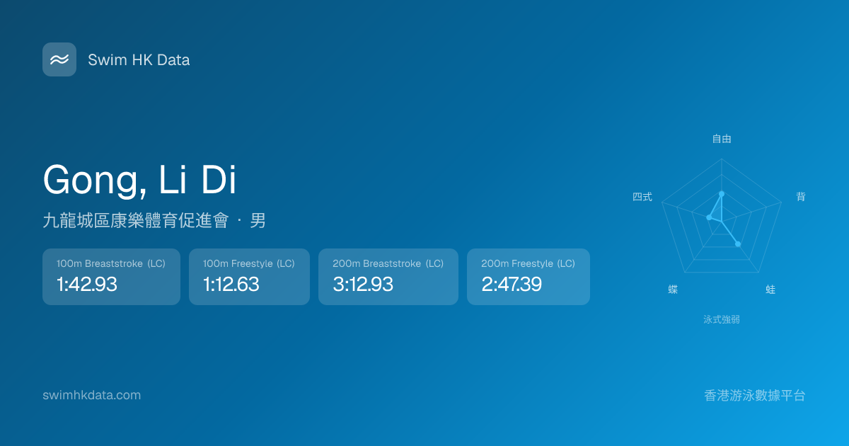 此圖表根據你所有比賽成績計算,顯示你在各泳式的相對強弱,僅供參考。繼續努力,每一次練習都會讓你更快更強!💪