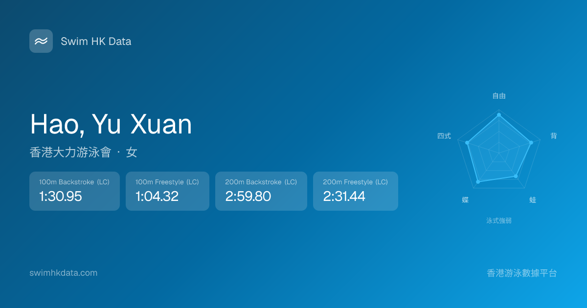 此圖表根據你所有比賽成績計算,顯示你在各泳式的相對強弱,僅供參考。繼續努力,每一次練習都會讓你更快更強!💪