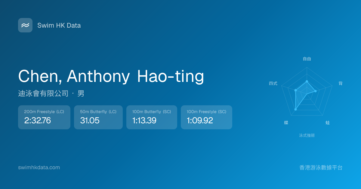 此圖表根據你所有比賽成績計算,顯示你在各泳式的相對強弱,僅供參考。繼續努力,每一次練習都會讓你更快更強!💪
