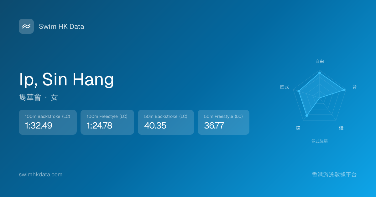 此圖表根據你所有比賽成績計算,顯示你在各泳式的相對強弱,僅供參考。繼續努力,每一次練習都會讓你更快更強!💪