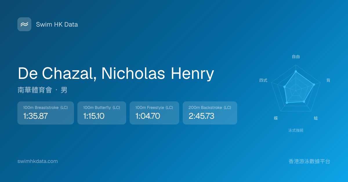 此圖表根據你所有比賽成績計算,顯示你在各泳式的相對強弱,僅供參考。繼續努力,每一次練習都會讓你更快更強!💪
