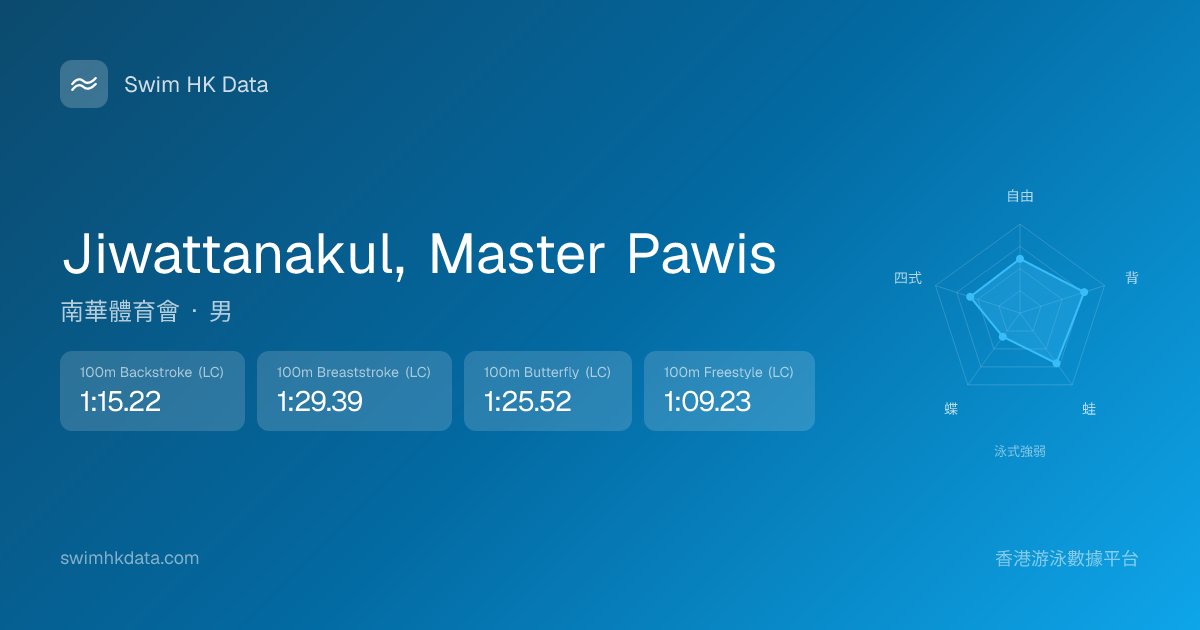此圖表根據你所有比賽成績計算,顯示你在各泳式的相對強弱,僅供參考。繼續努力,每一次練習都會讓你更快更強!💪