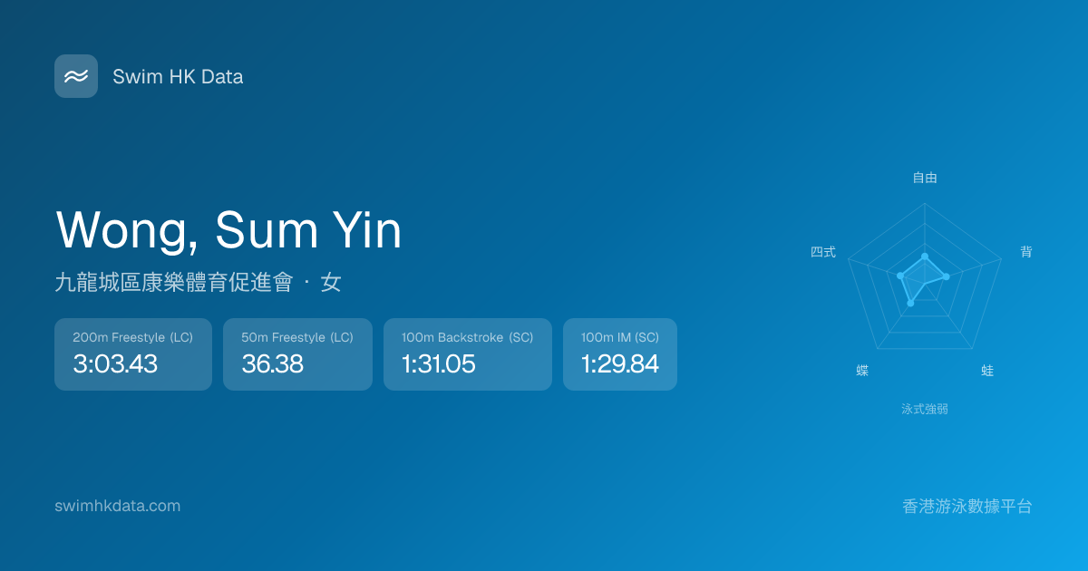 此圖表根據你所有比賽成績計算,顯示你在各泳式的相對強弱,僅供參考。繼續努力,每一次練習都會讓你更快更強!💪