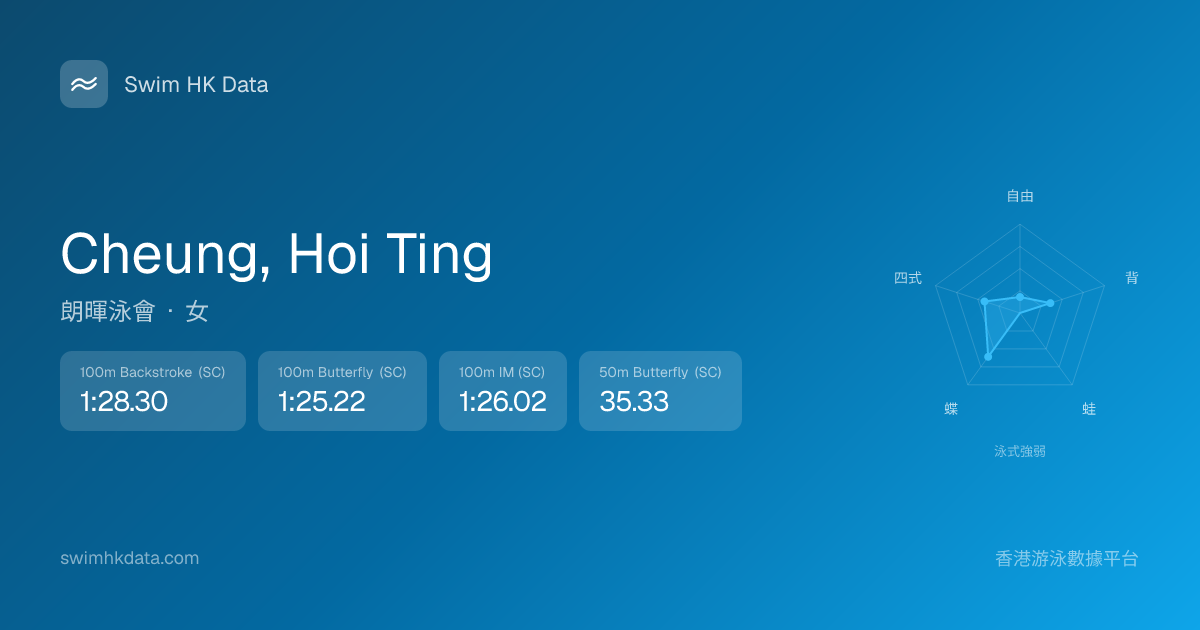 此圖表根據你所有比賽成績計算,顯示你在各泳式的相對強弱,僅供參考。繼續努力,每一次練習都會讓你更快更強!💪