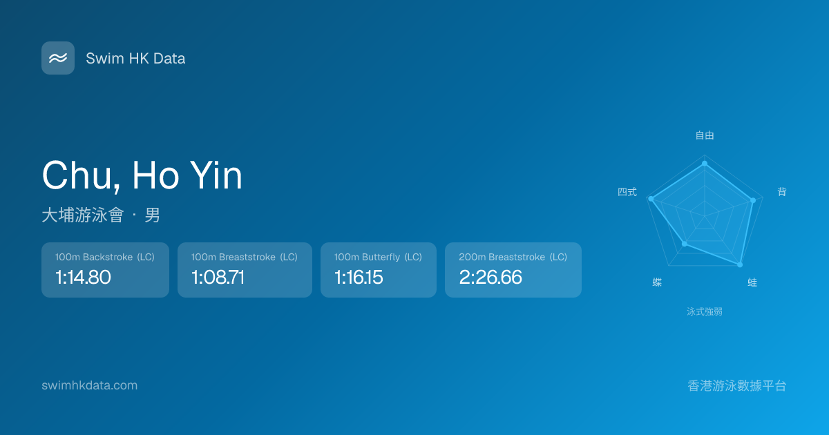 此圖表根據你所有比賽成績計算,顯示你在各泳式的相對強弱,僅供參考。繼續努力,每一次練習都會讓你更快更強!💪