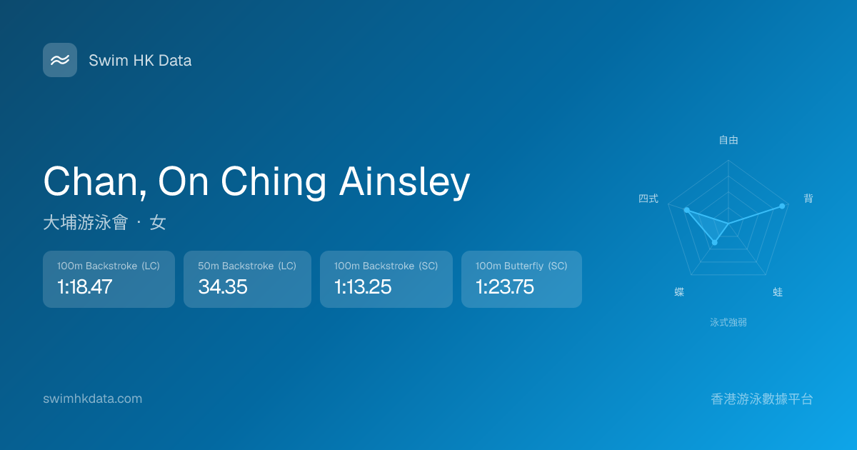 此圖表根據你所有比賽成績計算,顯示你在各泳式的相對強弱,僅供參考。繼續努力,每一次練習都會讓你更快更強!💪