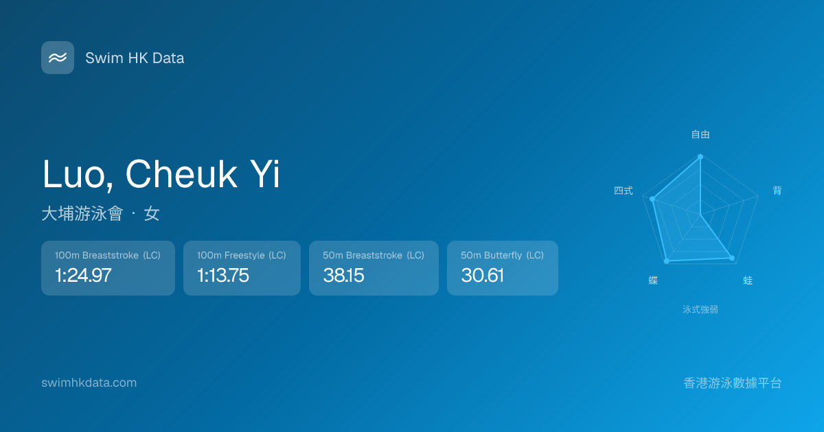 此圖表根據你所有比賽成績計算,顯示你在各泳式的相對強弱,僅供參考。繼續努力,每一次練習都會讓你更快更強!💪