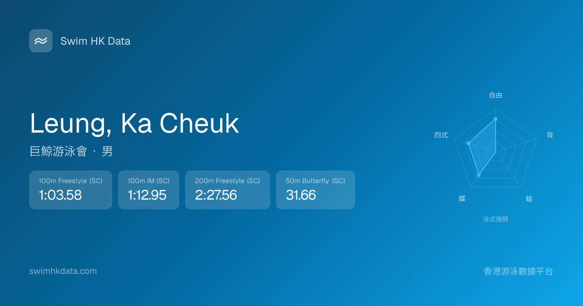此圖表根據你所有比賽成績計算,顯示你在各泳式的相對強弱,僅供參考。繼續努力,每一次練習都會讓你更快更強!💪