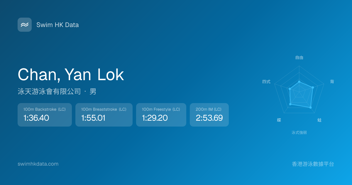 此圖表根據你所有比賽成績計算,顯示你在各泳式的相對強弱,僅供參考。繼續努力,每一次練習都會讓你更快更強!💪