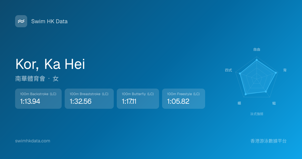 此圖表根據你所有比賽成績計算,顯示你在各泳式的相對強弱,僅供參考。繼續努力,每一次練習都會讓你更快更強!💪