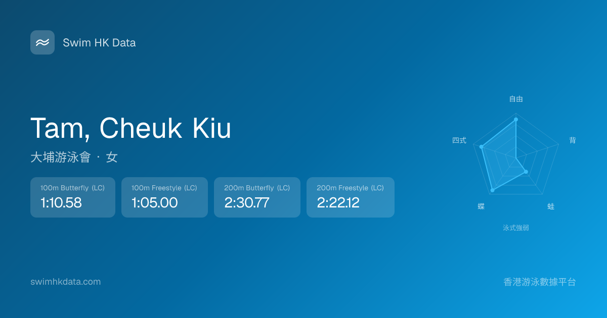 此圖表根據你所有比賽成績計算,顯示你在各泳式的相對強弱,僅供參考。繼續努力,每一次練習都會讓你更快更強!💪