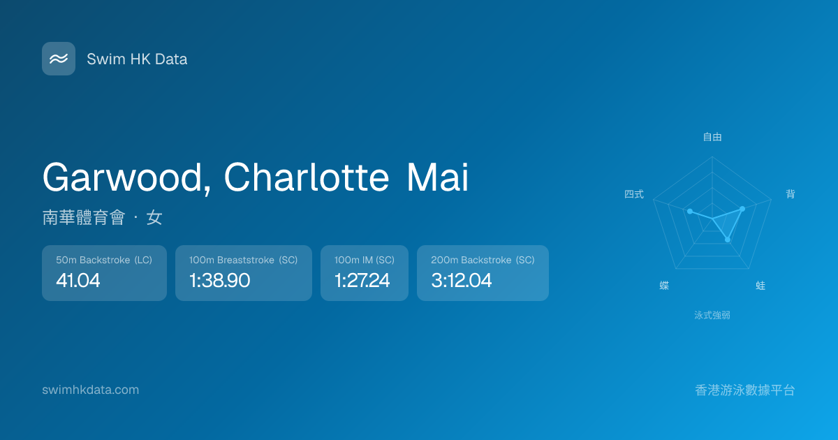 此圖表根據你所有比賽成績計算,顯示你在各泳式的相對強弱,僅供參考。繼續努力,每一次練習都會讓你更快更強!💪