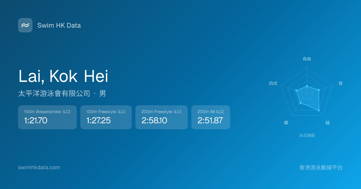 此圖表根據你所有比賽成績計算,顯示你在各泳式的相對強弱,僅供參考。繼續努力,每一次練習都會讓你更快更強!💪