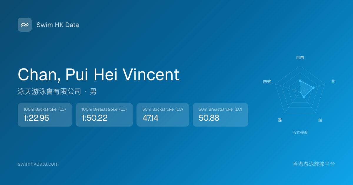 此圖表根據你所有比賽成績計算,顯示你在各泳式的相對強弱,僅供參考。繼續努力,每一次練習都會讓你更快更強!💪