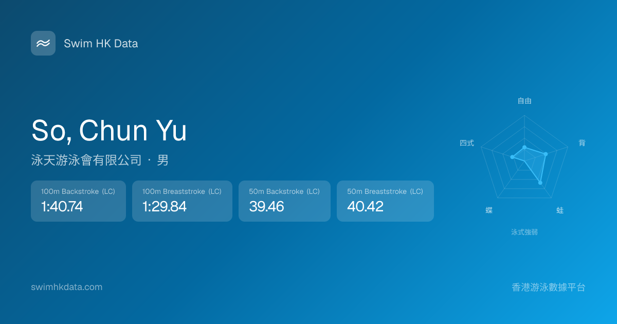 此圖表根據你所有比賽成績計算,顯示你在各泳式的相對強弱,僅供參考。繼續努力,每一次練習都會讓你更快更強!💪