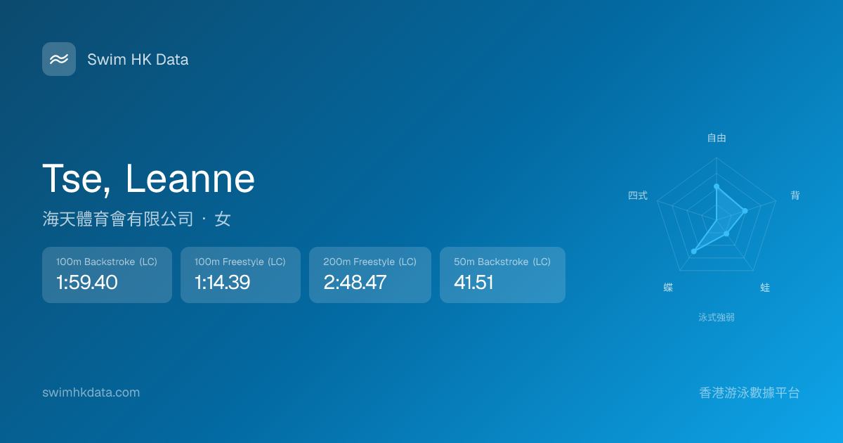 此圖表根據你所有比賽成績計算,顯示你在各泳式的相對強弱,僅供參考。繼續努力,每一次練習都會讓你更快更強!💪