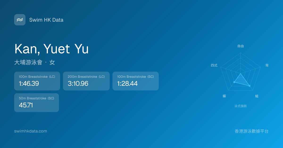 此圖表根據你所有比賽成績計算,顯示你在各泳式的相對強弱,僅供參考。繼續努力,每一次練習都會讓你更快更強!💪