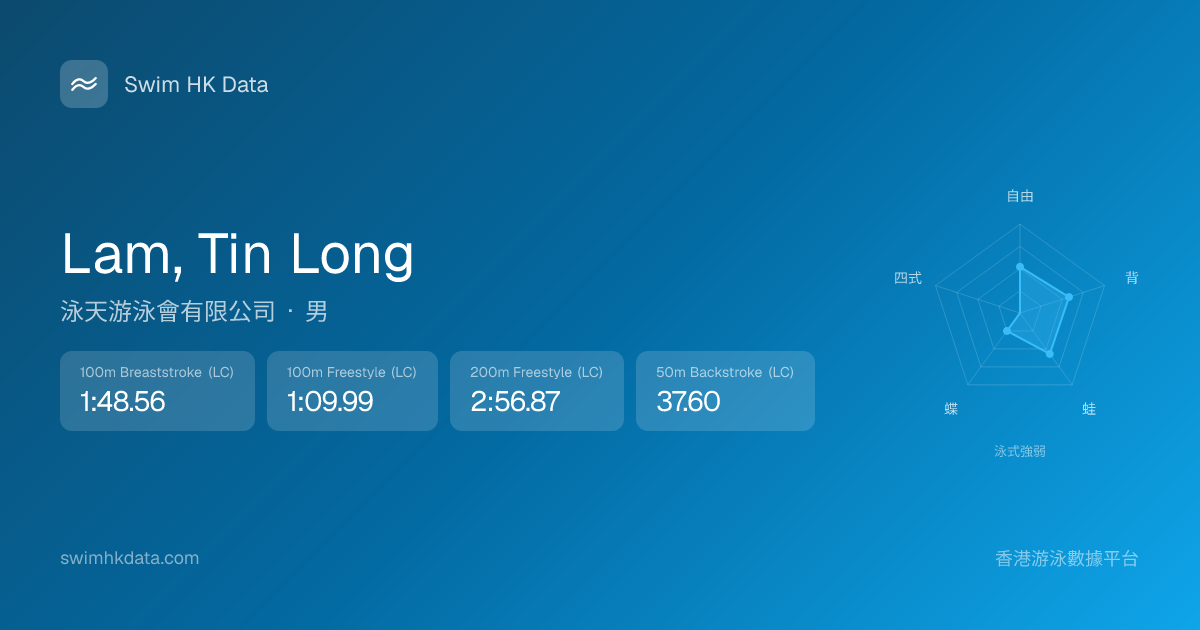此圖表根據你所有比賽成績計算,顯示你在各泳式的相對強弱,僅供參考。繼續努力,每一次練習都會讓你更快更強!💪