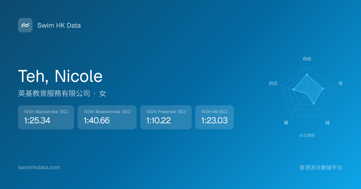 此圖表根據你所有比賽成績計算,顯示你在各泳式的相對強弱,僅供參考。繼續努力,每一次練習都會讓你更快更強!💪
