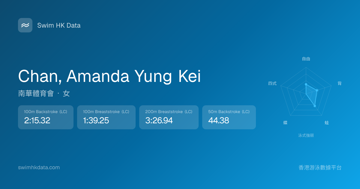 此圖表根據你所有比賽成績計算,顯示你在各泳式的相對強弱,僅供參考。繼續努力,每一次練習都會讓你更快更強!💪