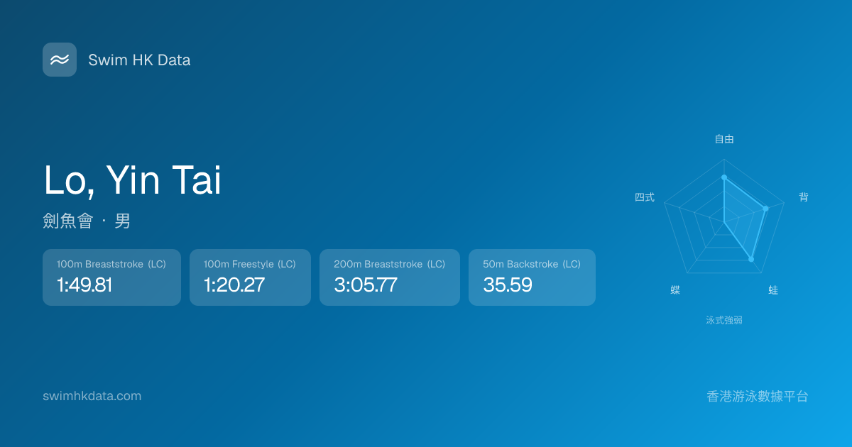 此圖表根據你所有比賽成績計算,顯示你在各泳式的相對強弱,僅供參考。繼續努力,每一次練習都會讓你更快更強!💪