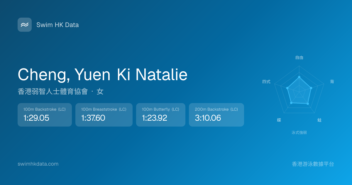 此圖表根據你所有比賽成績計算,顯示你在各泳式的相對強弱,僅供參考。繼續努力,每一次練習都會讓你更快更強!💪
