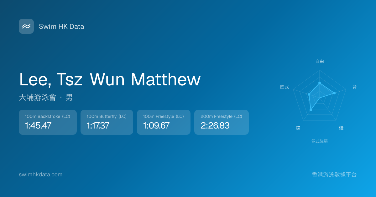 此圖表根據你所有比賽成績計算,顯示你在各泳式的相對強弱,僅供參考。繼續努力,每一次練習都會讓你更快更強!💪
