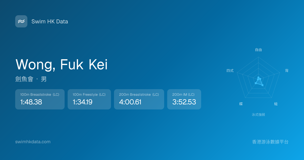 此圖表根據你所有比賽成績計算,顯示你在各泳式的相對強弱,僅供參考。繼續努力,每一次練習都會讓你更快更強!💪