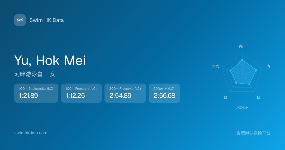 此圖表根據你所有比賽成績計算,顯示你在各泳式的相對強弱,僅供參考。繼續努力,每一次練習都會讓你更快更強!💪