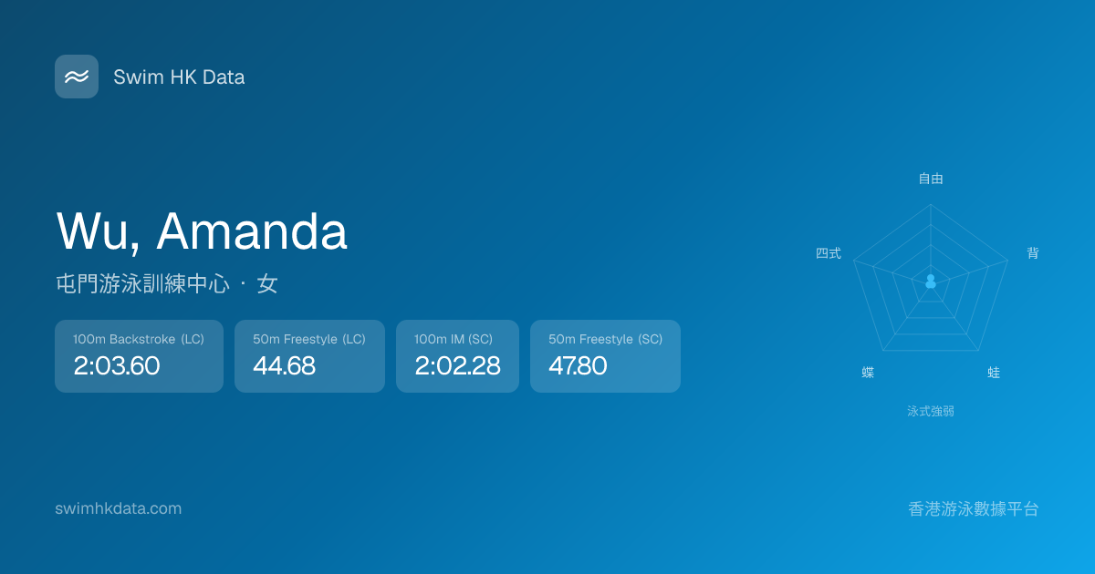 此圖表根據你所有比賽成績計算,顯示你在各泳式的相對強弱,僅供參考。繼續努力,每一次練習都會讓你更快更強!💪