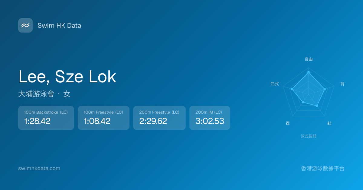 此圖表根據你所有比賽成績計算,顯示你在各泳式的相對強弱,僅供參考。繼續努力,每一次練習都會讓你更快更強!💪