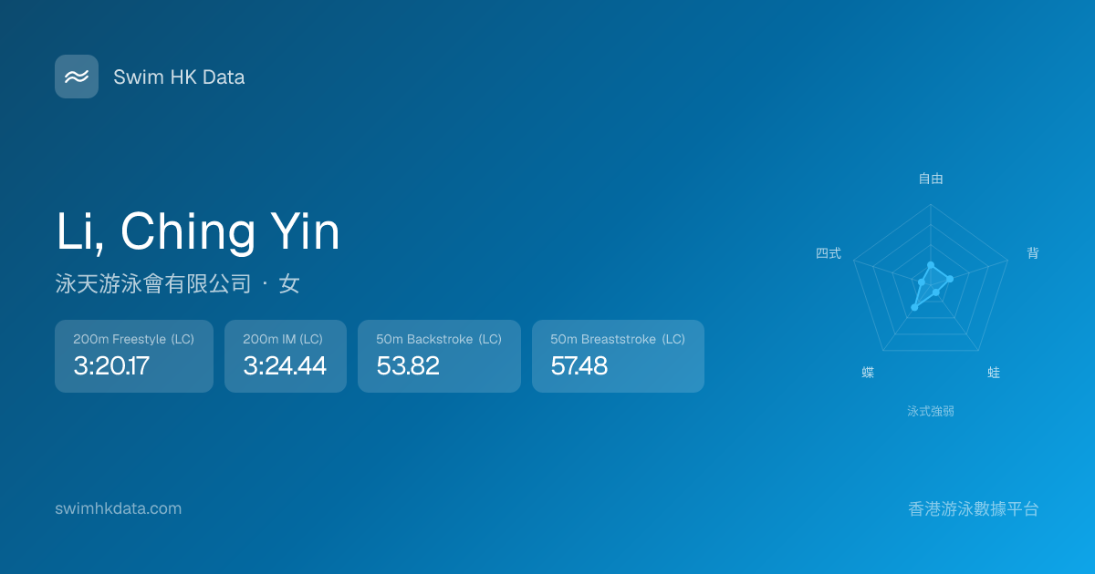 此圖表根據你所有比賽成績計算,顯示你在各泳式的相對強弱,僅供參考。繼續努力,每一次練習都會讓你更快更強!💪